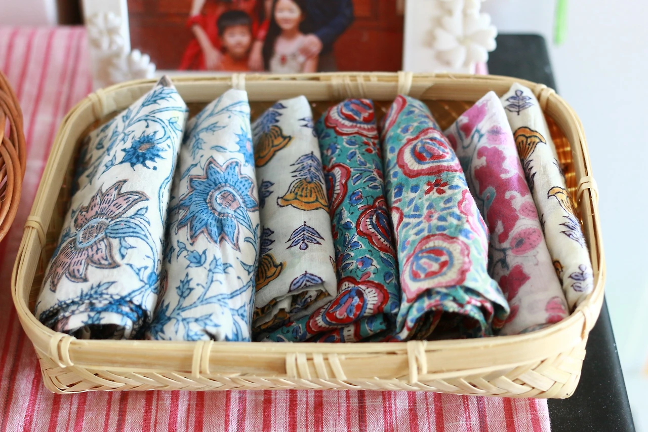 집에서 휴지나 키친타올 대신에 손수건을 사용한다. 사진은 나와 아이들이 사용하는 손수건. 소창이나 광목 같은 깔끔한 행주를 사용하는 대신에 알록달록한 손수건을 휴지 대신 사용했더니 아이들도 좋아하고 나도 기분이 좋다. 인도에 살 때 사온 좋은 패브릭들이다.