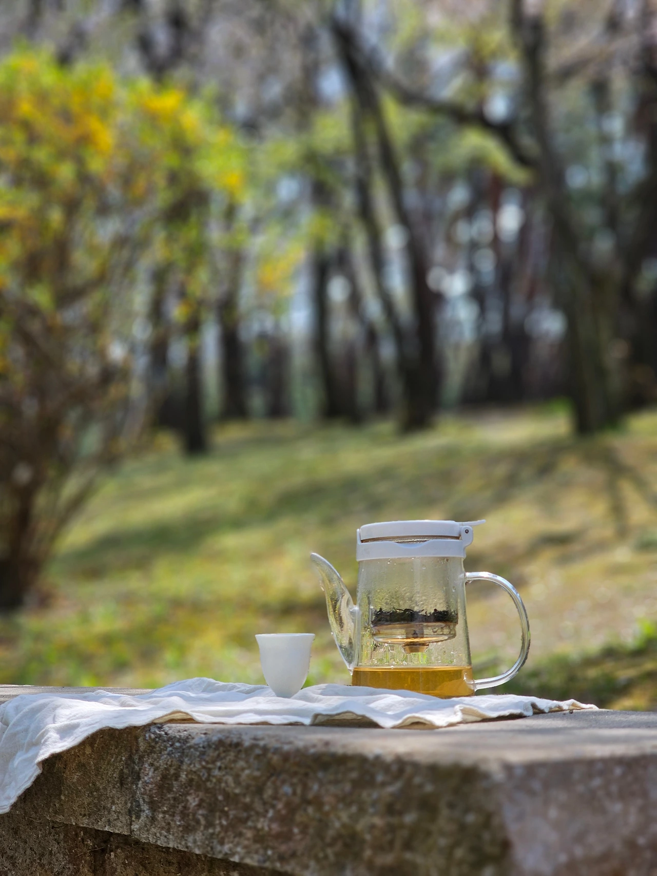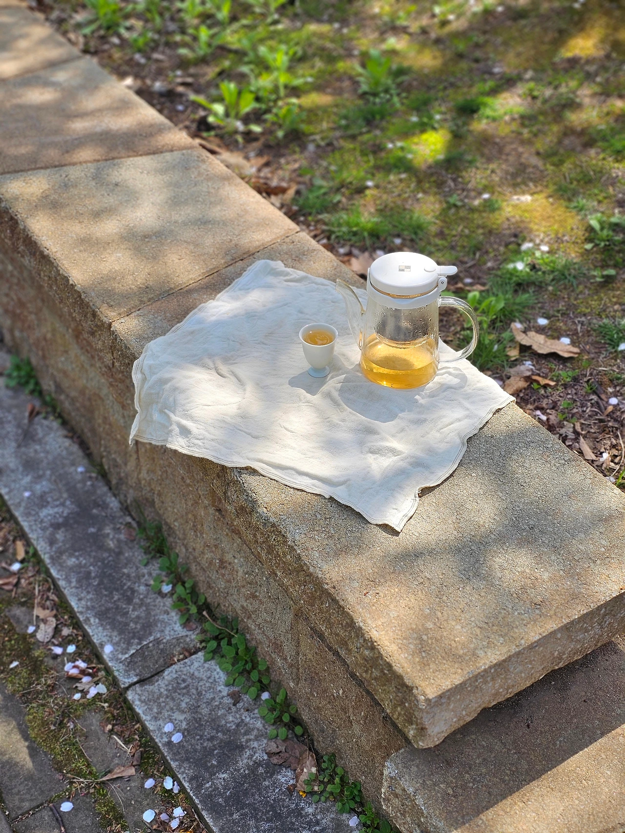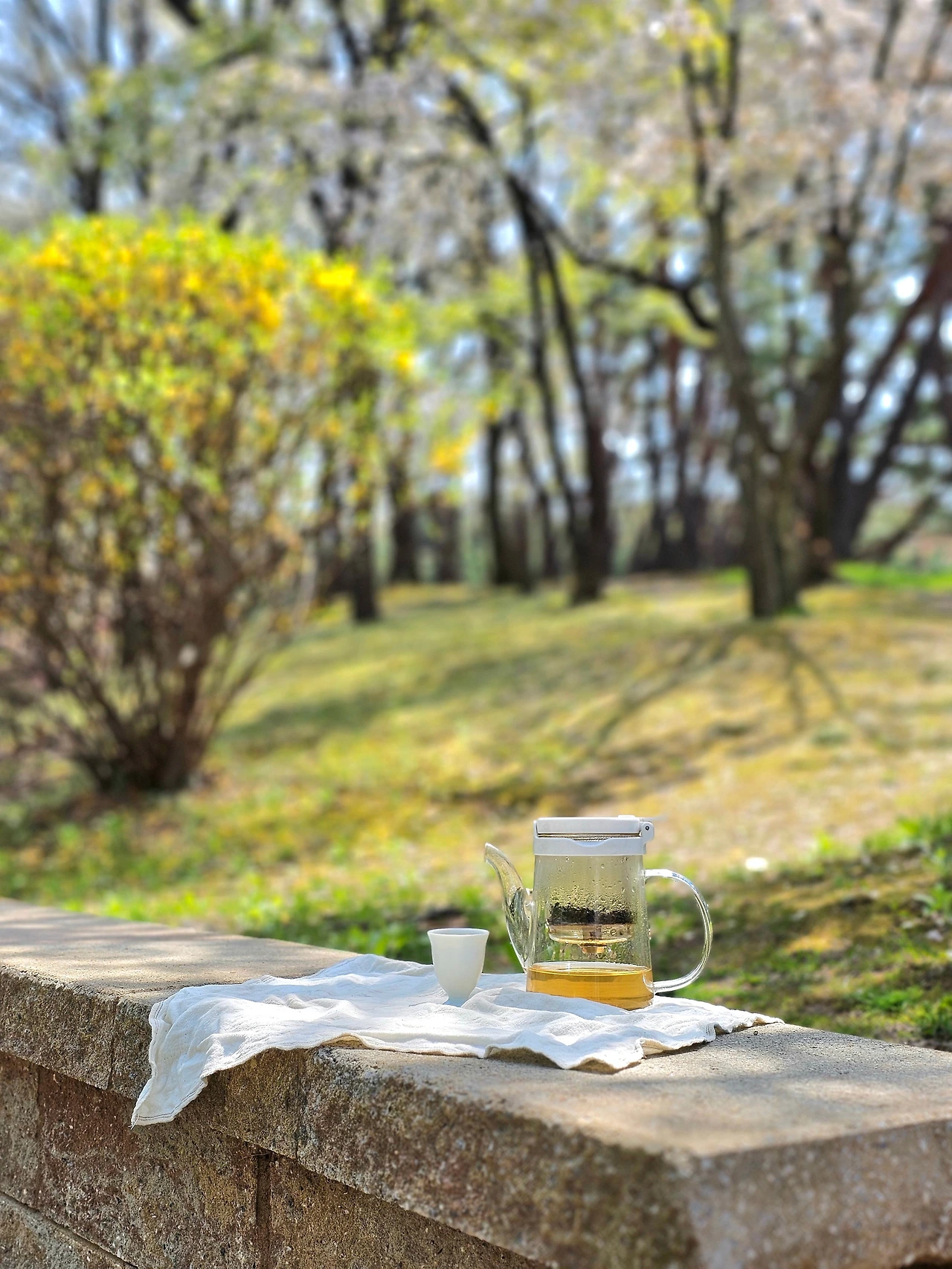 꽃잎이 살랑살랑 떨어지는 나무 아래에서 차 한 잔 우려마시고 있자니 신선놀음이 따로 없습니다. 산책하시던 할머니 한 분이 너무 좋아보인다고 말을 걸어주셔서 차를 한 잔 나누어드렸습니다. 아직 찬 공기가 남아 있어 따스한 발효차 한 잔이 더없이 좋습니다.