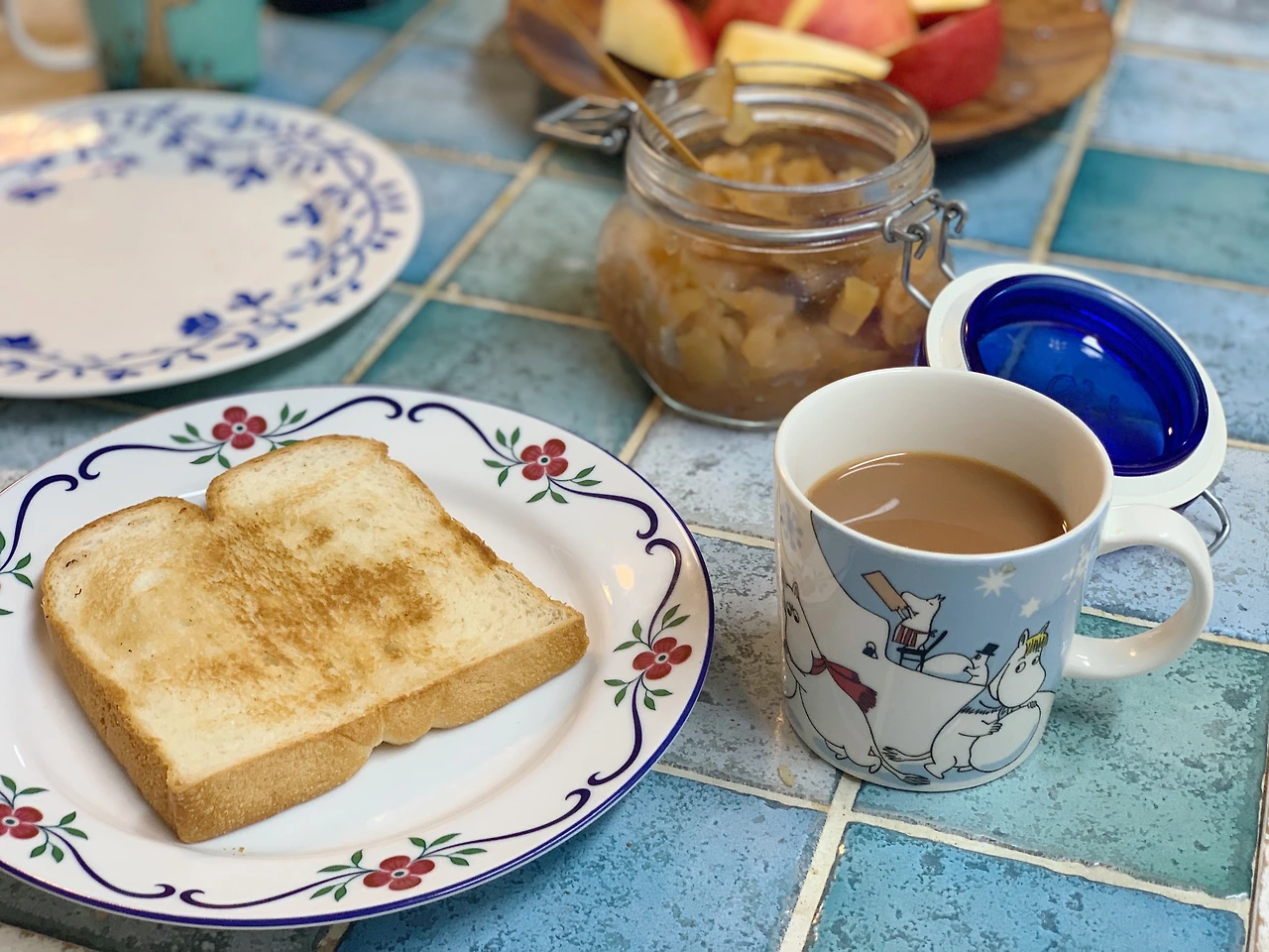 비가 와서, 밀크티. 두유 넣고 만든 밀크티에 전부터 애정하던 쌀가루 현미가루로 만든 야미요밀의 식빵, 어제 만들어둔 비건 버터, 굿모닝