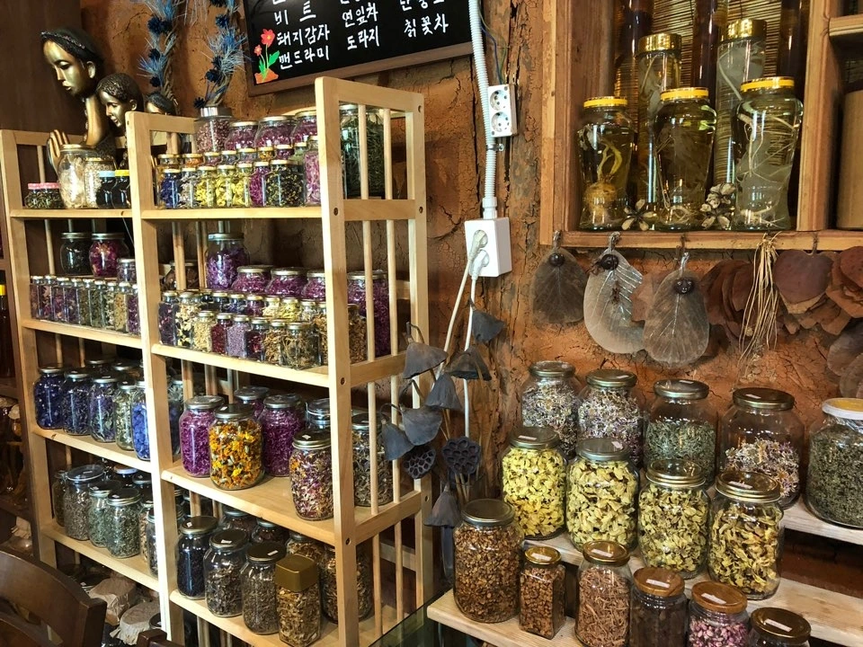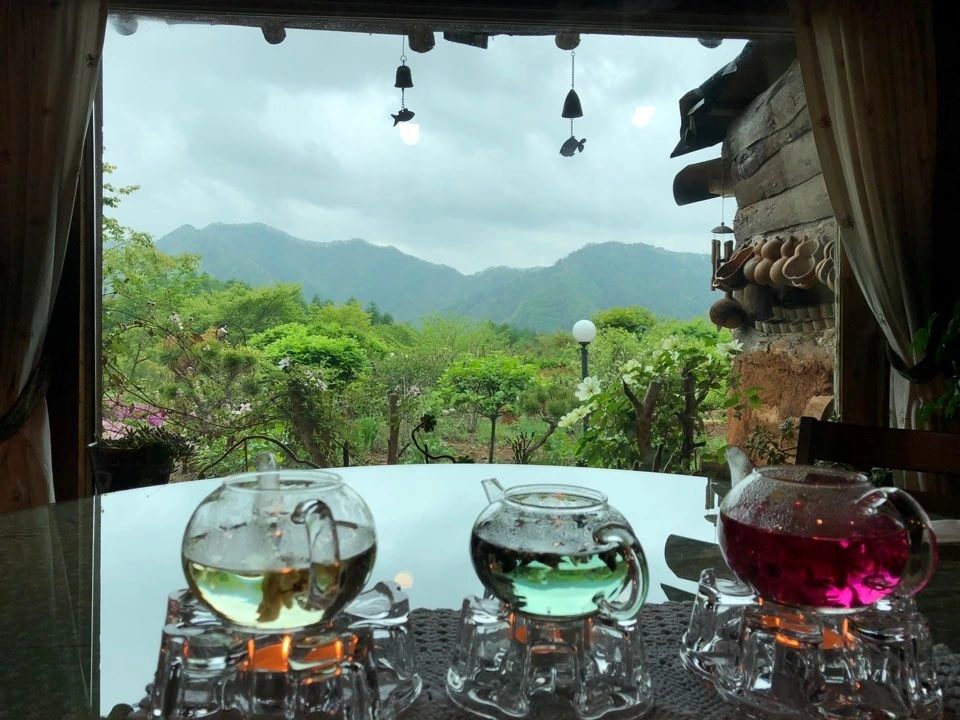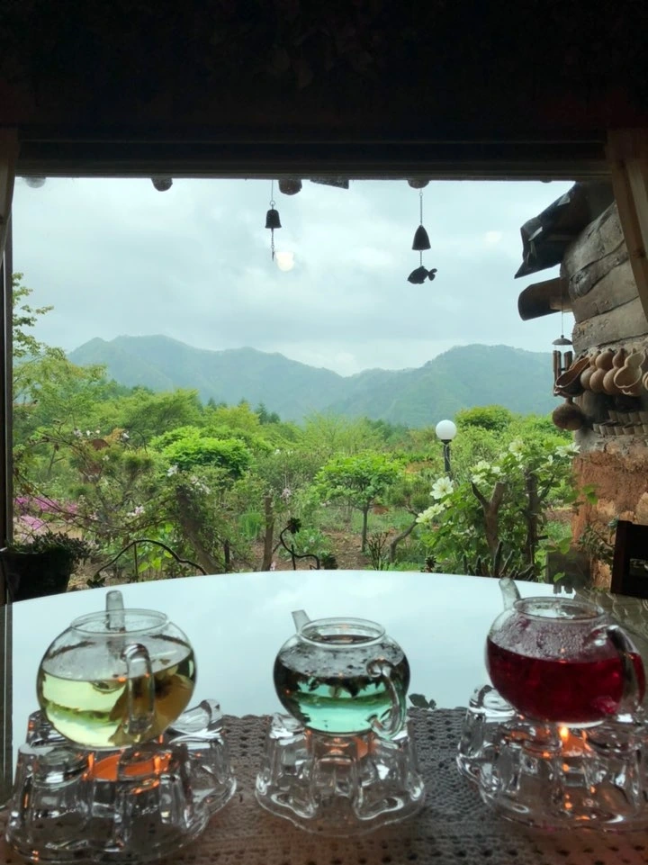 오미자나 커피 녹차와 같은 음료가 있었지만, 아주머니께서는 자랑스럽게 꽃차를 추천해주셨다. 도저히 하나만 고를 수 없어서 추천해 주시는 걸 마시겠다고 하니 포트를 세 개나 준비해 주셨다.