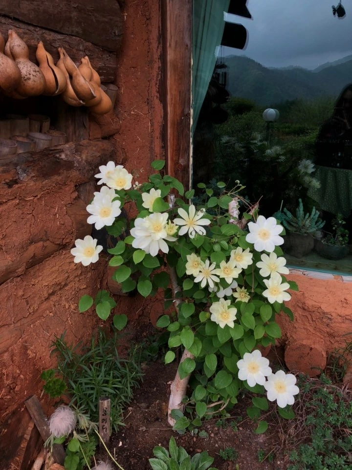 집 앞에는 으아리꽃들이 잔뜩 피어있었다. 호암미술관에서 으아리꽃들은 다 음지에서만 커서 예쁜 얼굴을 제대로 못봤었는데, 여기는 이렇게 으아리꽃들이 손님을 맞이하고 있었다.