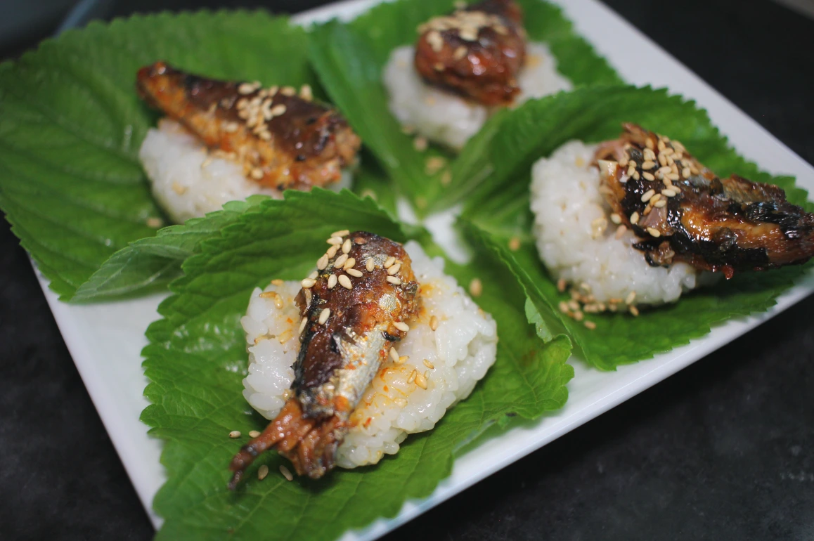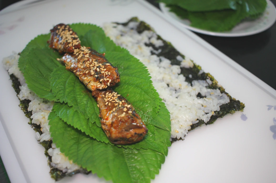 3. 김 위에 밥을 한주먹 덜어 넓게 펴고, 깻잎 (취향에 따라 다양한 쌈채소를 활용해도 좋다)을 5장 정도 넉넉하게 깔아준 다음 조린 꽁치를 나란히 나란히 올려준다 (꽁치에 간이 충분히 배어있기 때문에 쌈채소를 넉넉하게 넣어 밸런스를 맞춰주면 좋다).