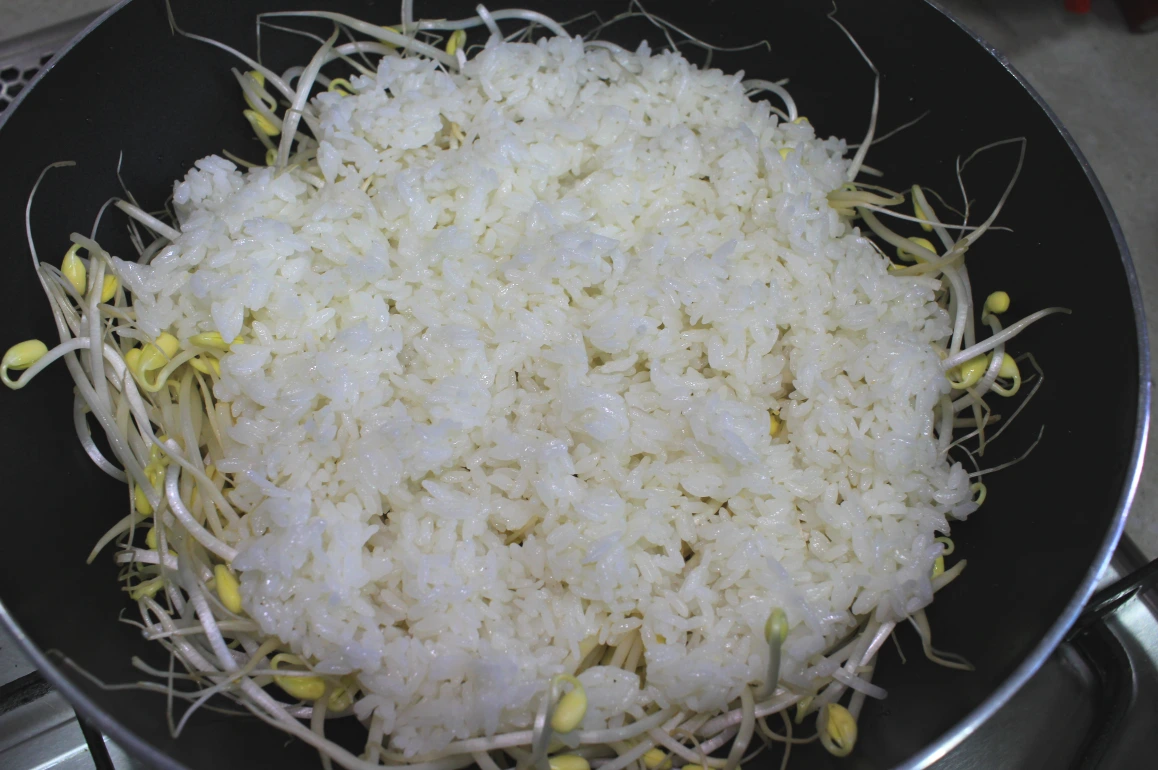 (*콩나물 냄새가 사라진 뒤, 냄비 속 수분이 졸아들 때까지만 약불에서 쪄주고 [뚜껑 닫은 채로], 이후 수분이 잘 졸아들지 않으면 뚜껑을 열어 밥과 콩나물을 주걱으로 살짝 덖어주면 수분이 날아간다.)