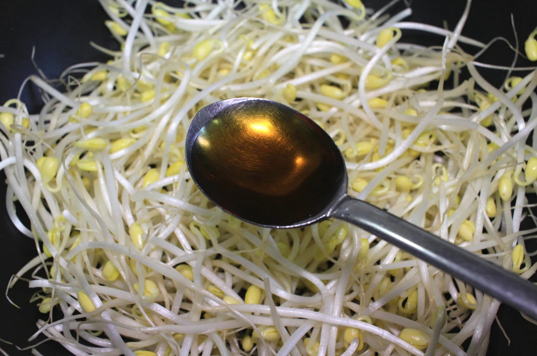 1. 냄비/웍에 콩나물을 깔아준 뒤, 물 2T + 맛술 1T + 참기름 2T를 넣어준다.