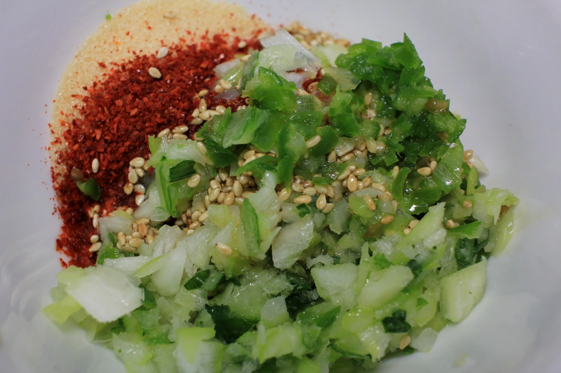 * 비빔 양념장 재료: 다진 마늘 1T, 다진 땡초 1개, 고춧가루 1T, 다진 대파 한뿌리, 양조간장 1T, 국간장 3T, 맛술 1T, 식초 1T, 설탕 1T, 매실액 1T, 통깨 1T, 참기름 1T.