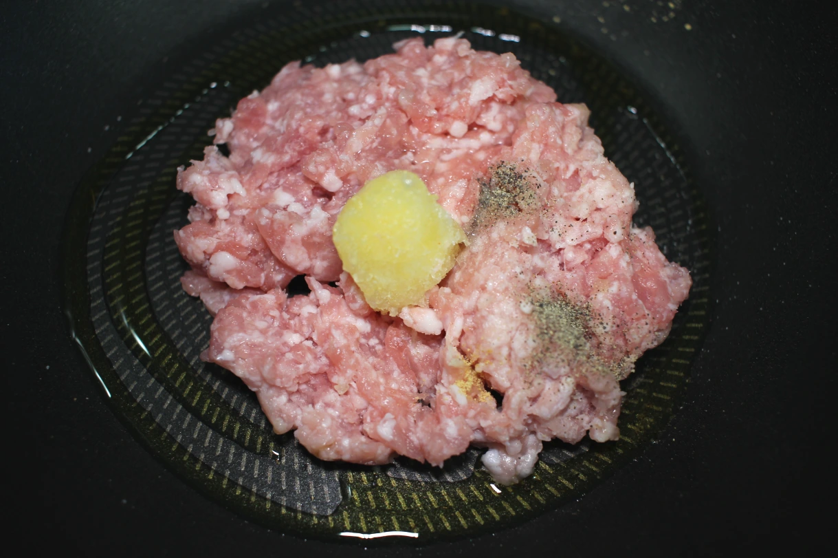 5. 올리브유 1T를 두른 웍에, 다진 돼지고기와 다진 마늘 1/2T, 후추 1/3t, 소금 1/3t, 생강가루 한 꼬집, 맛술 1.5t를 넣고 볶아준다.