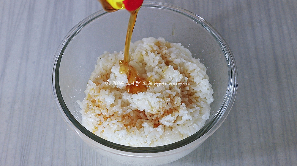 밥에 소금과 깨, 참기름을 넣고 밑간한다.
