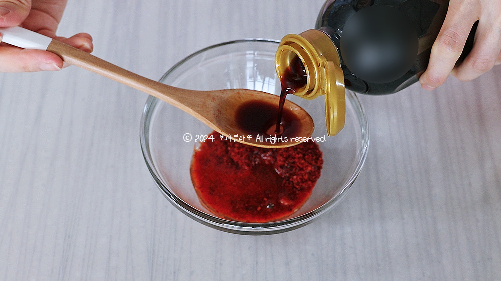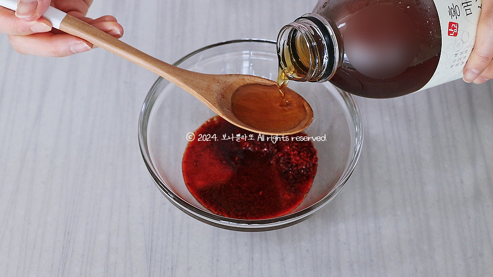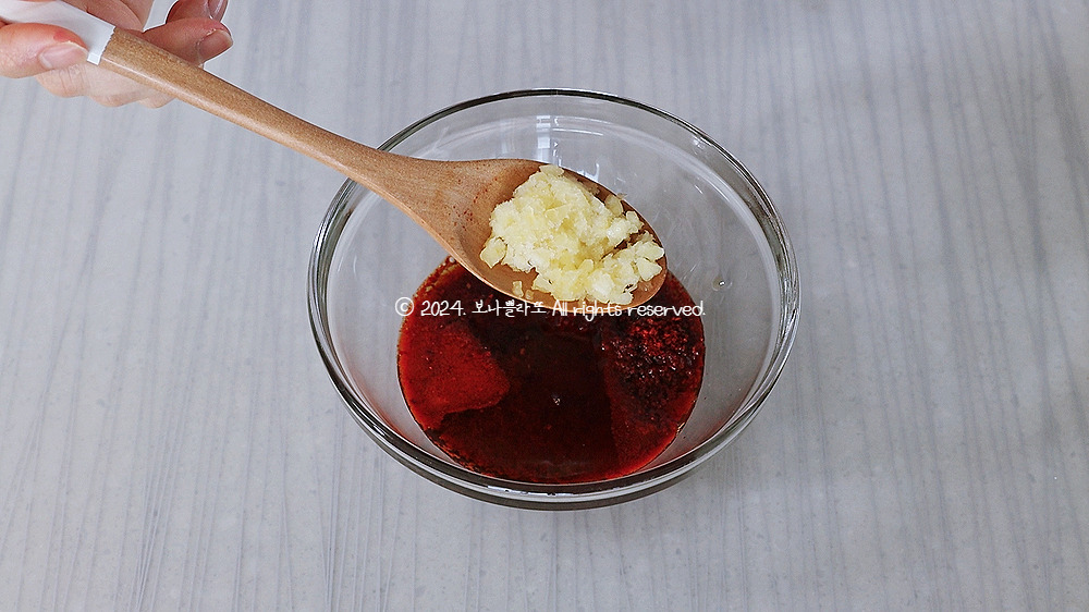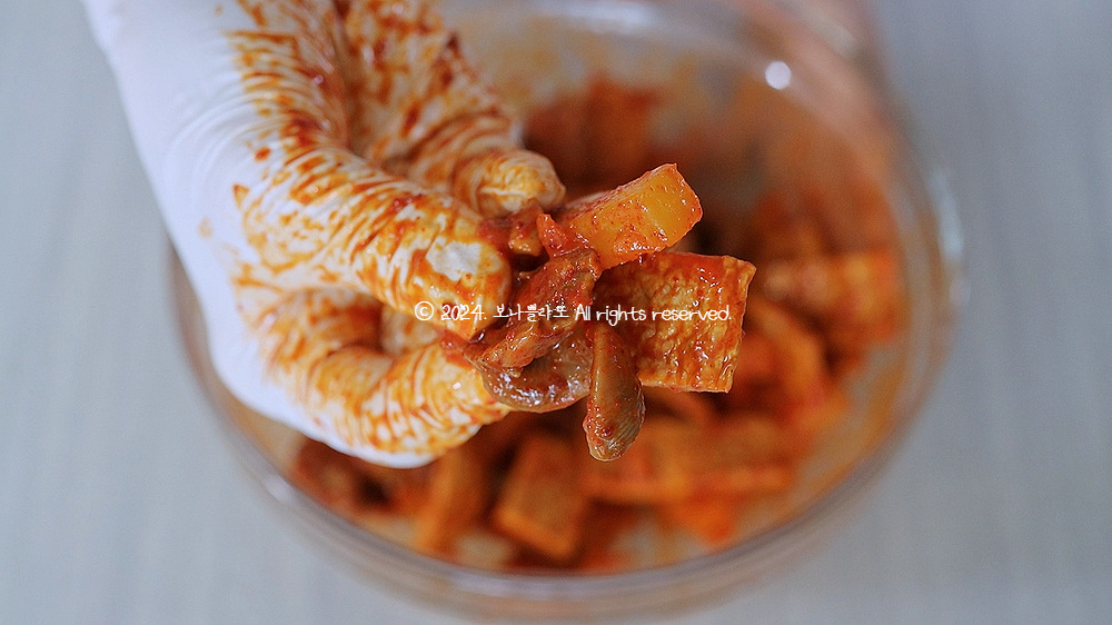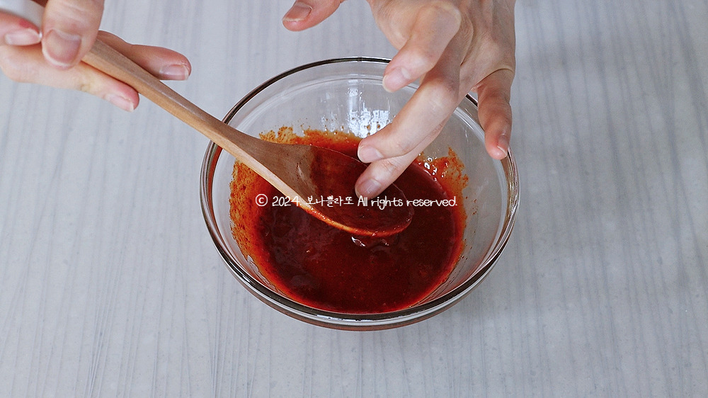 양념: 고운 고춧가루 2T, 일반 고춧가루 1T, 식초 3T, 간장 2T, 물엿 2T, 액젓 1T, 매실액 1T, 참기름 2T, 간 마늘 2/3T.