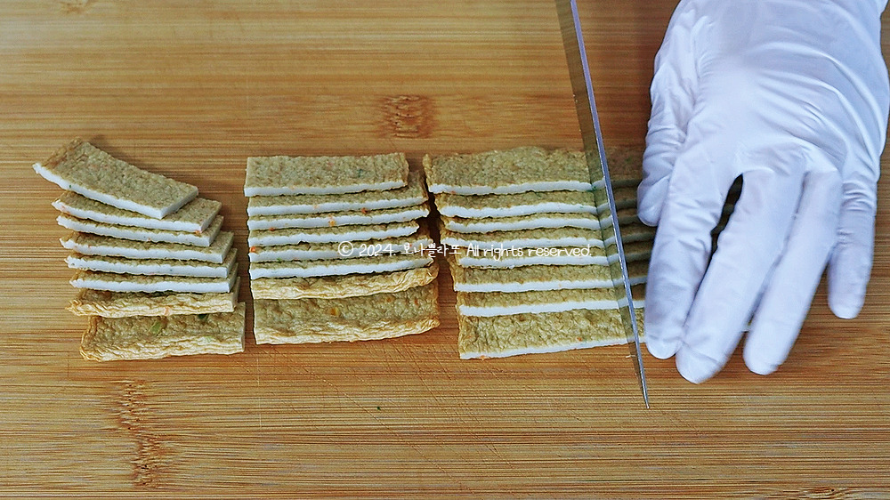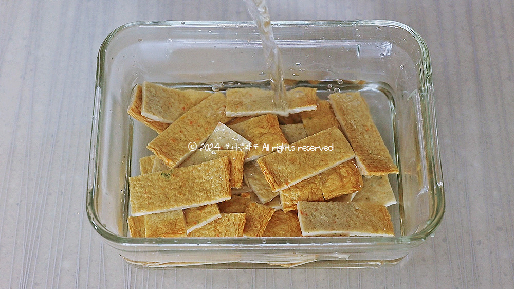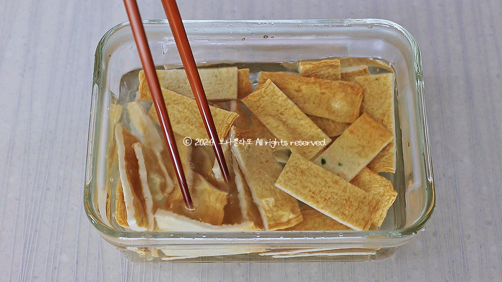 어묵을 단무지와 비슷한 크기로 썰어, 뜨거운 물에 담가 기름기를 빼준다.