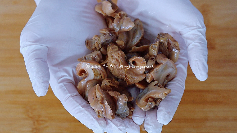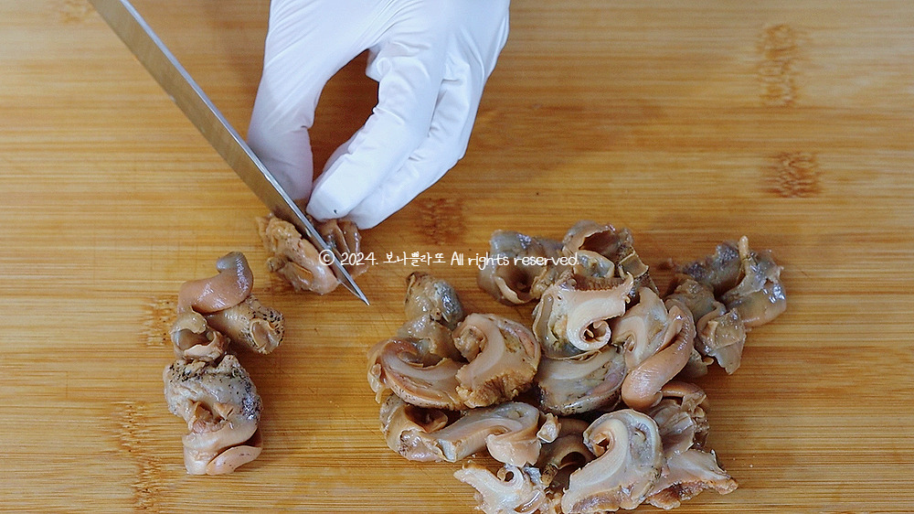 통조림 골뱅이의 물기를 제거한 뒤, 먹기 좋게 썰어준다.