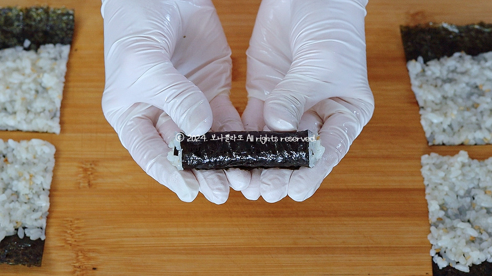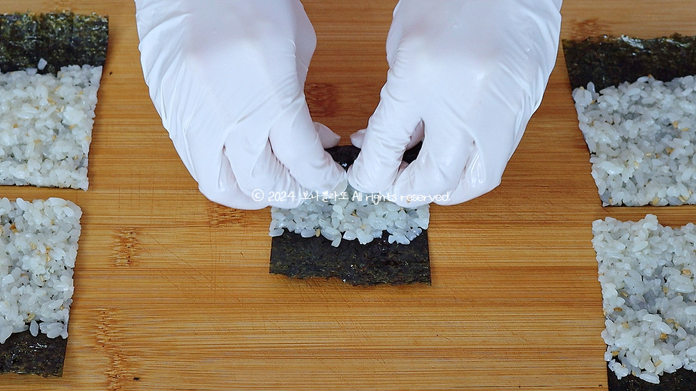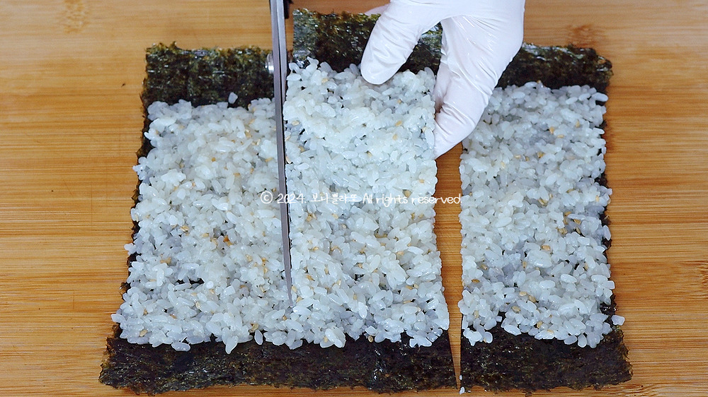 김 위, 아래 1.5cm 정도만 남기고 중앙에 밥을 펼친 뒤,
