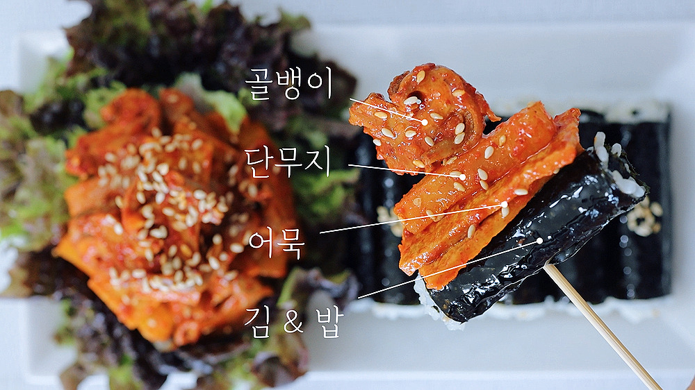 밥 1.5인분 (소금, 참기름, 깨 적당량), 김 2장, 사각 어묵 2장, 골뱅이 통조림 300g 1캔, 김밥 단무지 5줄.