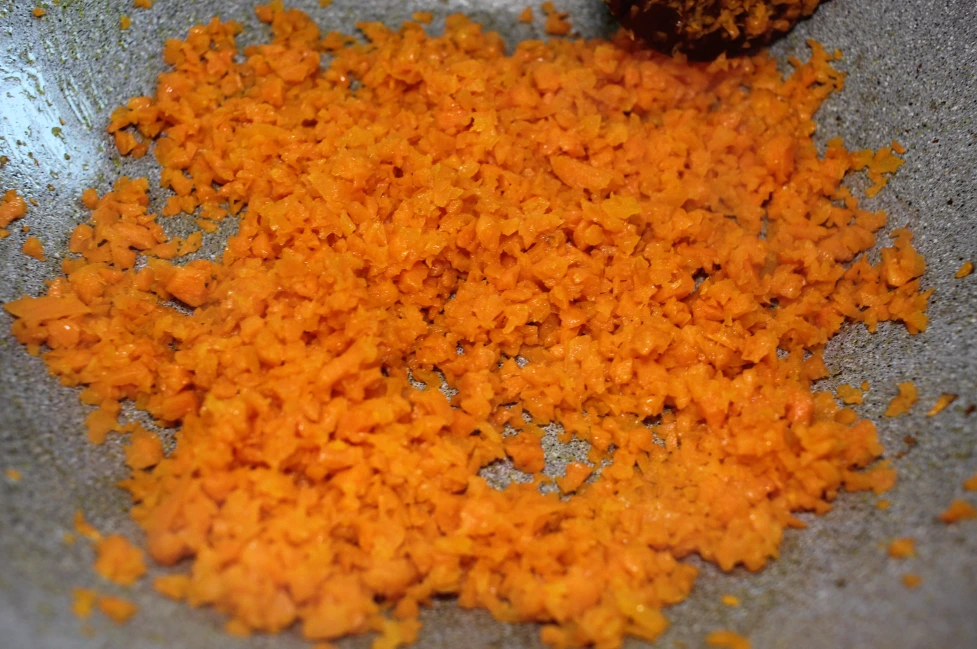 2. 올리브유를 살짝 두른 웍에 다진 당근 (200g)을 넣고 수분이 날아가도록 야무지게 볶아준다 (소금 한 꼬집으로 간을 살짝 해준다).