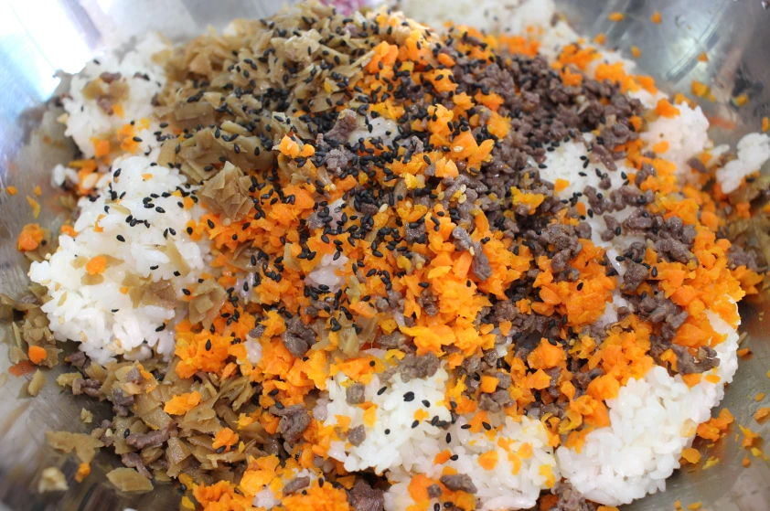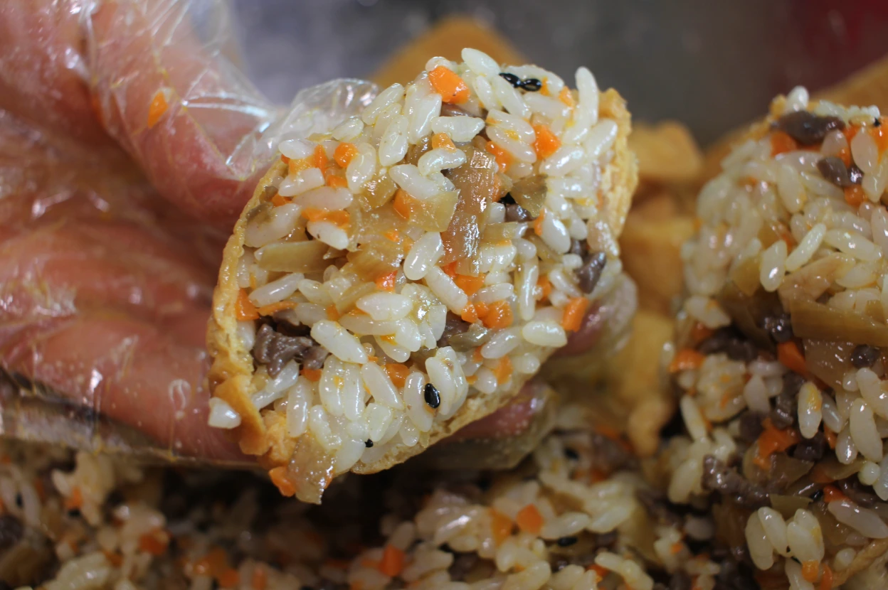 * 주 재료: 밥 (3인분), 유부 (4인분), 다진 소고기 (200g), 다진 당근 (200g), 우엉 (200g).