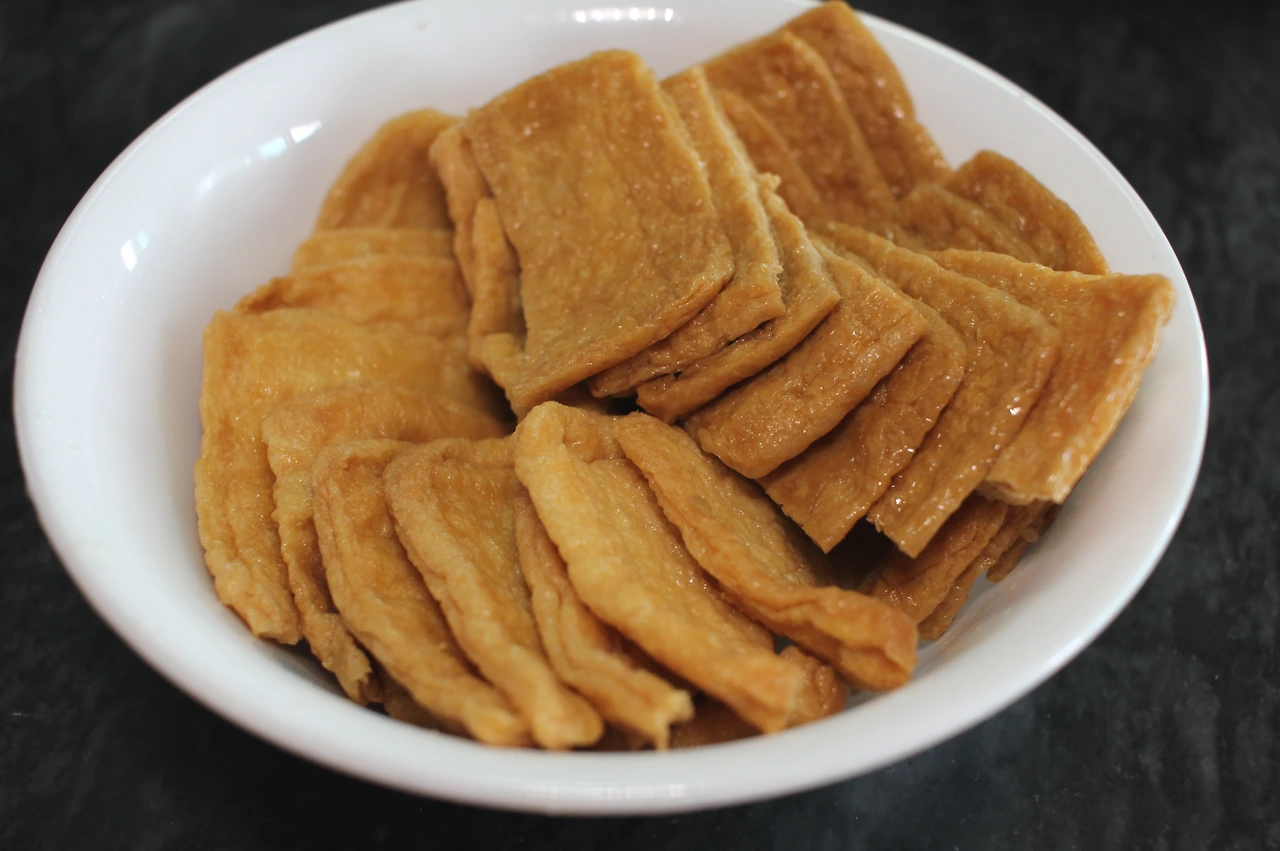 4. 유부는 꺼내어 손으로 국물을 한번 쫙 짜준다 (기호에 따라, 뜨거운 물에 유부를 담갔다 빼주면 기름기와 짠맛이 적당히 빠진 담백한 유부를 맛볼 수도 있다).