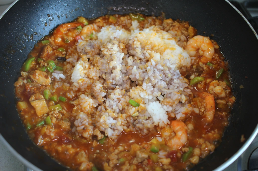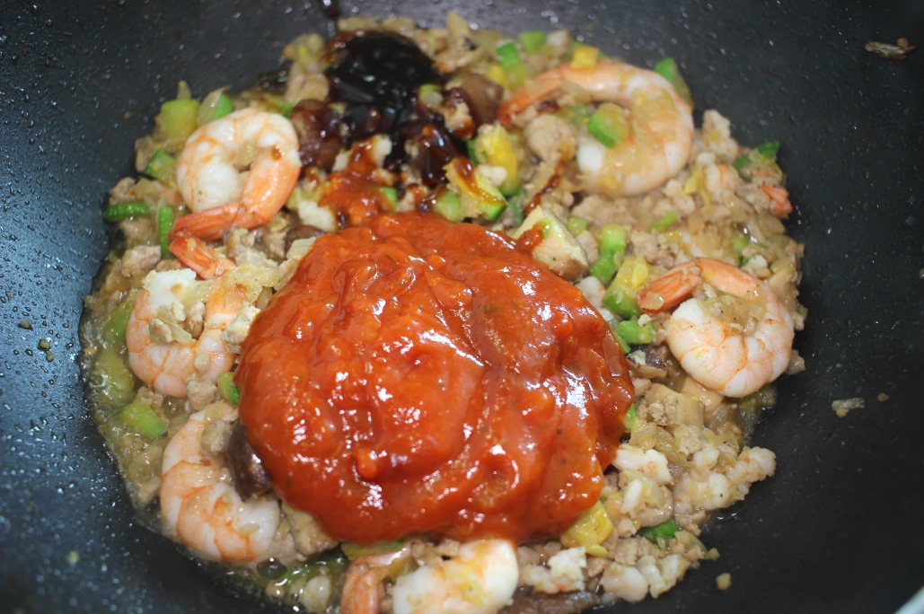 * 주 재료: 다짐육 (돼지고기: 120g), 새우 14마리, 양파 1/2개, 호박 1/3개, 표고버섯 3개, 다진 마늘 2T, 페퍼론치뇨 4알, 토마토 파스타 소스 6T, 굴소스 1T, 물 2 종이컵, 밥 2인분. (선택사항: 파마산 치즈 1T, 모차렐라 치즈 두 줌)