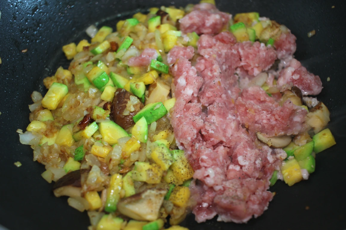 3. 어느 정도 볶다가 다진 돼지고기와 후추를 톡톡톡 뿌려 같이 볶아준다.