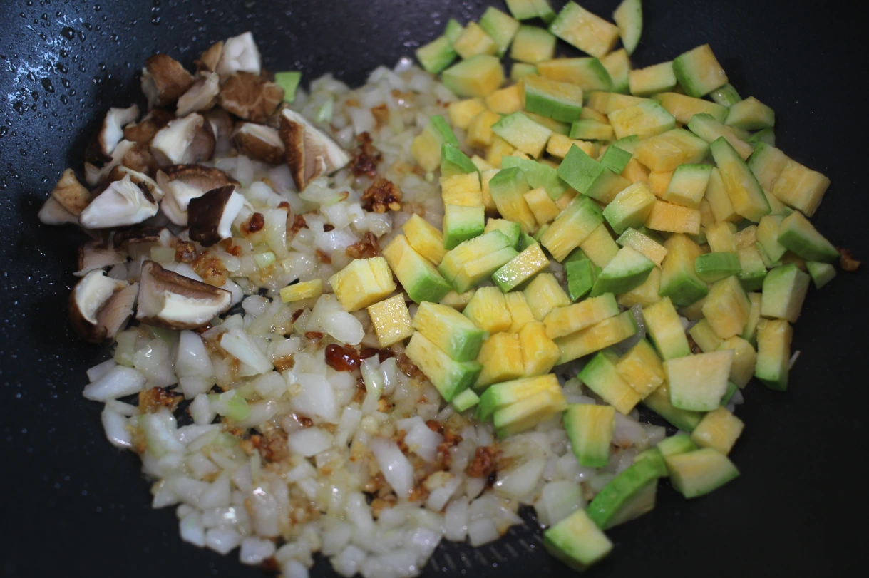 2. 먹기 좋게 자른 양파와 버섯, 호박을 넣고 같이 볶아준다.