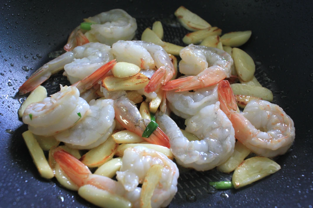 1. 올리브유를 한-두 바퀴 둘러 달궈진 웍에 편 마늘 한 줌을 넣어 마늘 기름을 내준 다음, 해동한 새우 12마리를 넣고 후추 톡톡 뿌려 살짝 볶아준다.