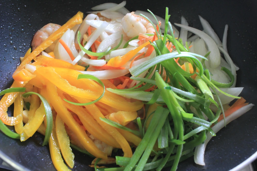 2. 새우가 얼추 익으면 (핑크색으로 변신) 준비한 채소들을 (세로 방향으로 썰어주면 집어먹기 좋다) 우르르 쏟아 넣고 솔솔 볶아준 다음 (살짝 숨이 죽을 정도만), 미리 준비해둔 스크램블 에그도 넣어준다 (조금 귀찮더라도 스크램블은 따로 만들어 넣어주면 채소들과 엉겨 붙지 않고 깔끔하게 볶아진다).