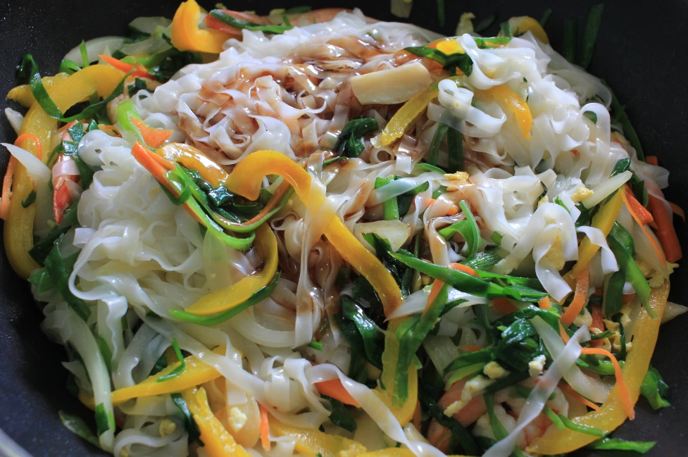 다시 태국 음식으로 돌아가 보자. 태국 대표 음식인 볶음 쌀국수, 바로 팟타이다. 팟 (pad)의 볶음이라는 의미와 타이 (thai)의 태국이라는 의미가 합해져, 태국식 볶음 요리를 뜻한다고 한다. 달콤, 새콤, 짭조름한 삼박자가 잘 어우러진 볶음 쌀국수. 특히, 피시소스 특유의 짭조름한 맛과 향, 그리고 숙주의 아삭함이 뇌리에 남는 요리이기도 하다. 그 맛을 우리 집 냉장고에 있는 재료들로 흉내 내보려 한다. 비록 냉장고엔 숙주가 없지만, 뭐 어떠랴. 아삭한 식감의 채소들로 대체해서 야무지게 만들어 보기로 한다 (이 없으면 잇몸, 요즘엔 임플란트인가?).