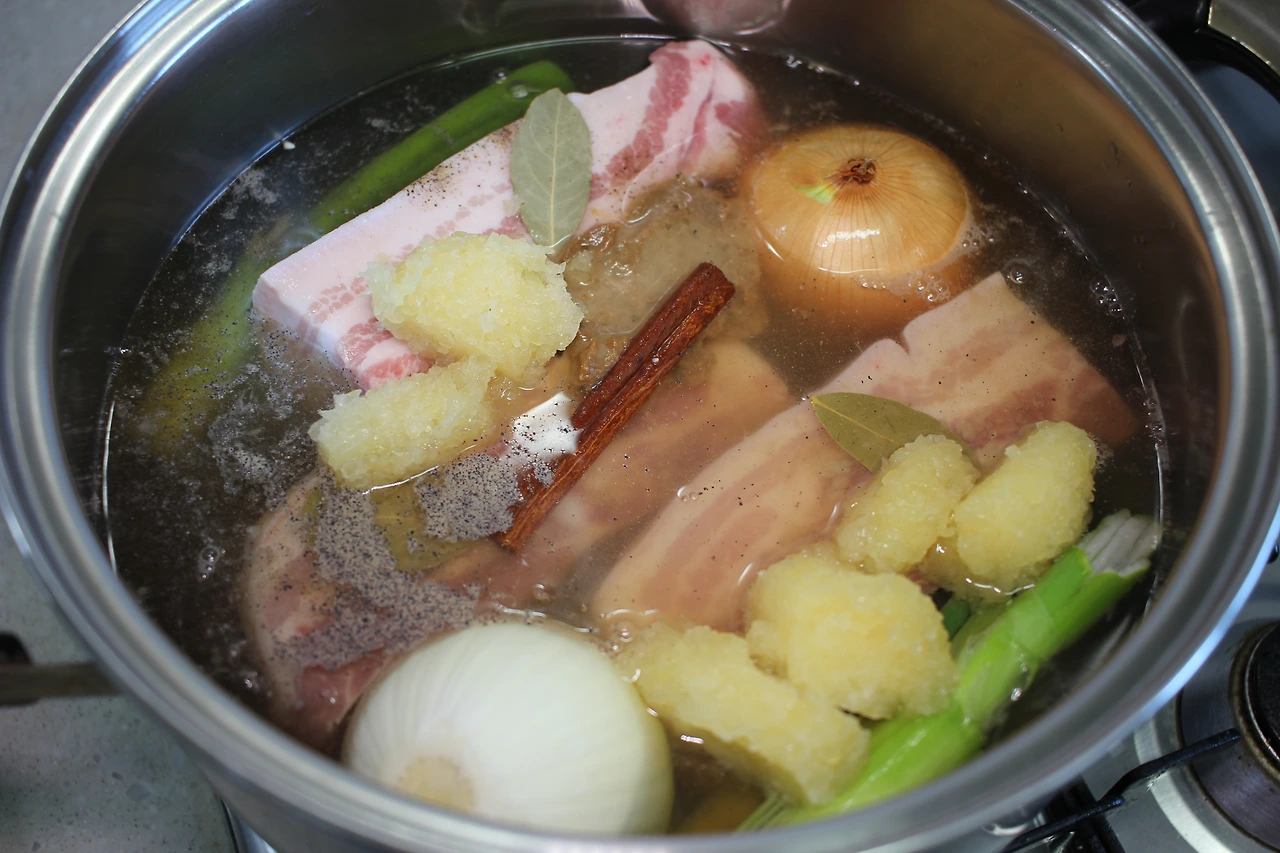 1. 재료들을 준비해준다 (*양파는 가능하면 껍질째 세척해 넣어주면 더 좋다). 당일 구매한 신선한 돼지고기라면 잡내 걱정은 특별히 없지만, 수육 만들 때만큼은 갖은 재료 (생강가루, 후추, 월계수 잎, 계피 스틱 등등)를 넣어 혹시 모를 잡내도 잡아주고 은은한 향도 더해줄 수 있어 좋다.