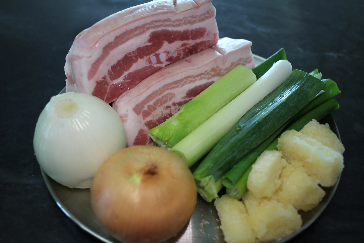 * 주 재료: 돼지고기 오겹살 한 근 반 (900g), 양파 400g (작은 것 두 개), 다진 마늘 100g (4-5T), 대파 200g (2-3대), 콜라 미니 사이즈 1캔 (210ml), 물 1L (재료가 잠길 정도로), 된장 1큰술, 소주 2큰술, 계피 스틱 1개, 생강 1/2ts, 후추 1ts, 월계수 잎 3장. (*기호에 따라, 좀 더 간간한 수육을 원한다면 된장의 양을 더 추가해줘도 좋다.)