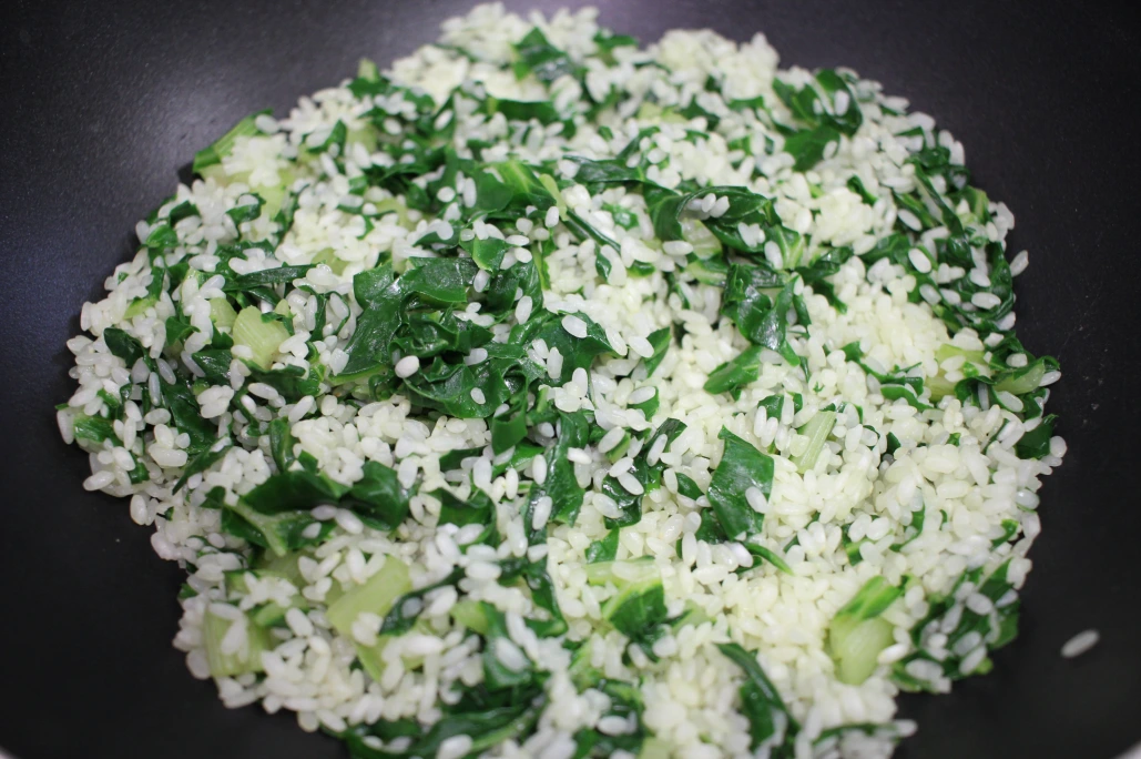 3. 손질한 근대를 먹기 좋게 잘라, 웍에 들기름을 두르고 살짝 숨이 죽도록 볶아준 다음 불린 쌀을 넣고 1분 정도 수분이 날아가도록 같이 볶아준 다음, 밥솥에 넣고 (다시마를 우려낸) 물을 넣어 밥을 지어준다. (*단, 근대를 넣었기 때문에, 밥물은 평소보다 살짝 적게 넣어주면 밥이 질어지는 것을 예방할 수 있다.)
