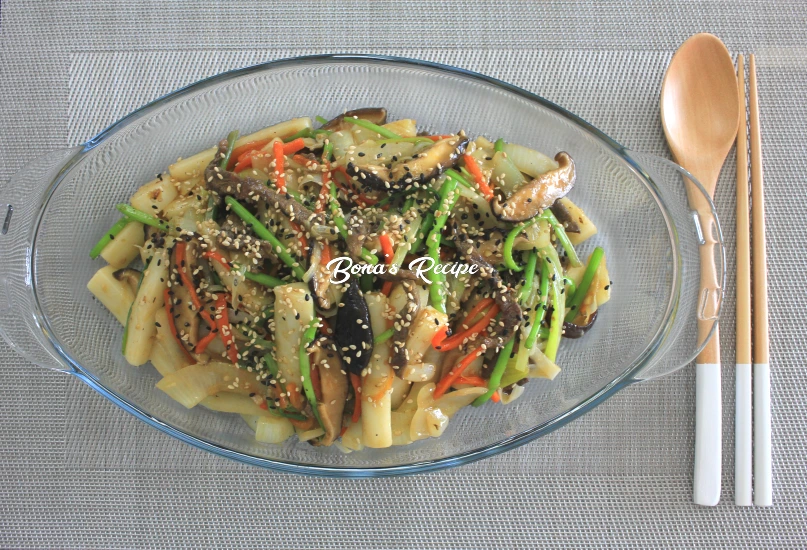 * 주 재료: 가래떡 (300g), 소고기 (100g), 표고버섯 (50g), 당근 (50g), 양파 (200g), 미나리 (60g), 대파 (50g), 물 100ml.