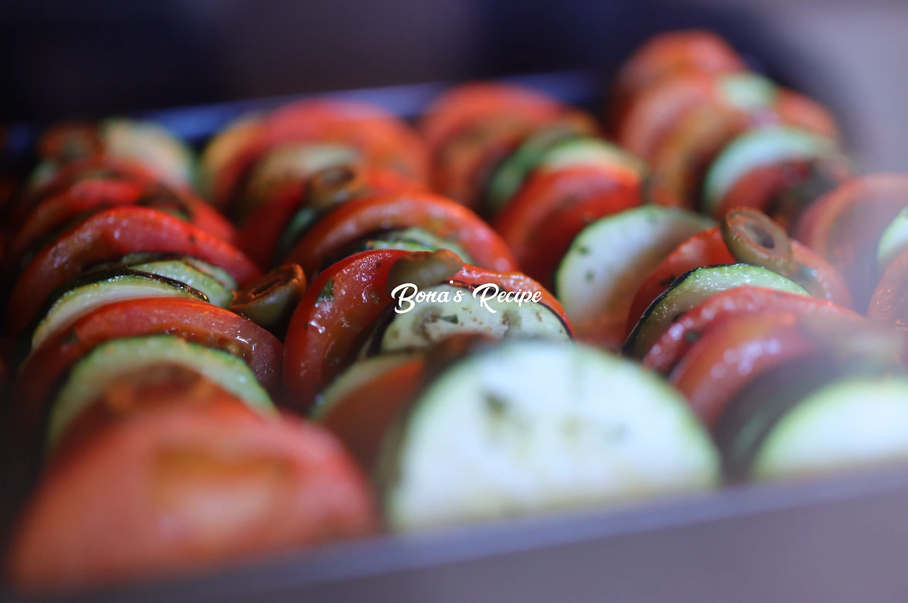 * 주 재료: 가지 1개, 쥬키니 호박 1개, 대저 토마토 8개, 돼지 다짐육 200g, 다진 양파 1/2개, 양송이버섯 6개.