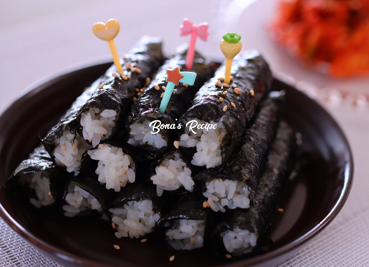 * 주 재료: 밥 2인분 (참기름 1T, 통깨 1T), 김밥용 김 8장.