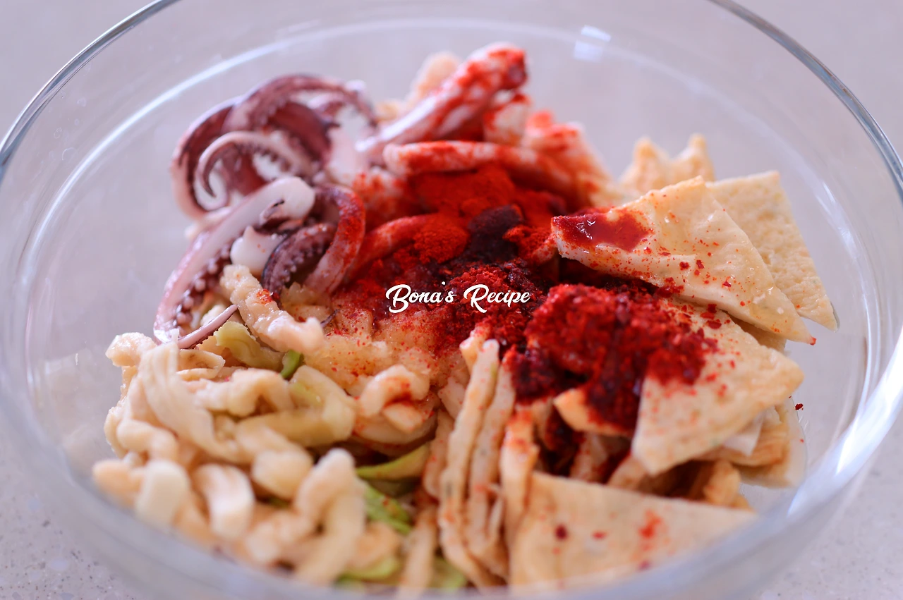 [+] '식초'를 넣어, 먹기 좋을만치 새콤한 적당히 삭힌 느낌마저 내뿜는 오징어&어묵 무침을 즐길 수 있다.