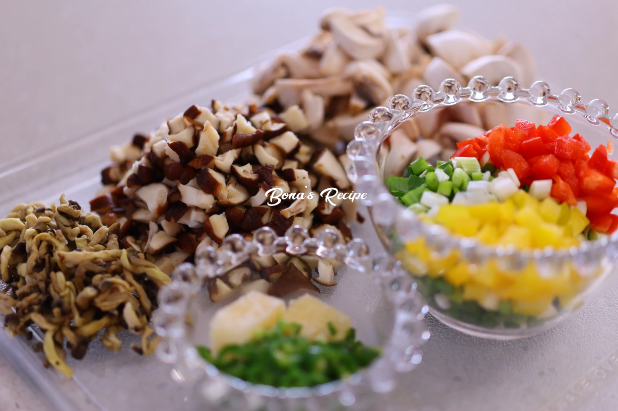 * 만두소: 버섯 (표고버섯 10개, 느타리버섯 한 줌, 양송이버섯 4개), 다진 마늘 1T, 다진 청양고추 [땡초] 2개, 쪽파 한 줌 (10대), 자투리 파프리카 약간, 굴소스 1T, 토마토소스 5T, 피자치즈 약간.