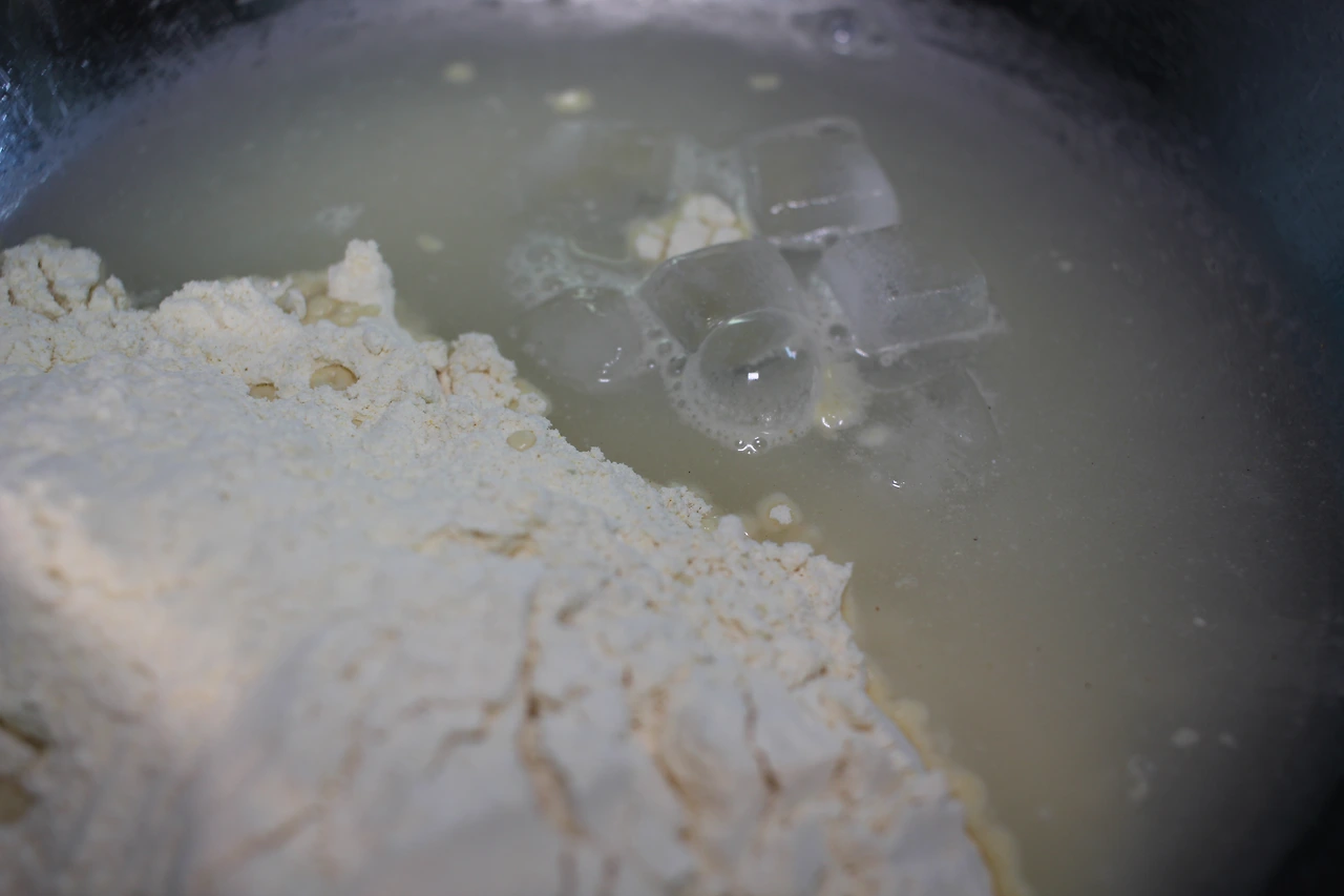 2. 쌀튀김가루 : 얼음물 = 1 : 1 정도로 섞어 반죽을 준비한다 (반죽에 얼음을 넣어주면 좀 더 바삭하게 튀겨진다는 학계의 전설을 따라본다).