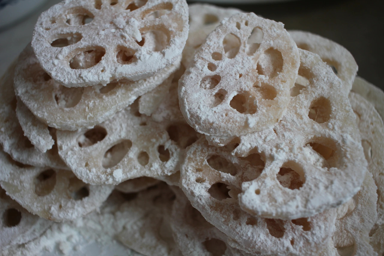 3. 연근에 먼저 찹쌀가루를 묻혀준다 (많이 묻히기보다는 얇게 코팅하듯이 묻혀주는 게 좋다).
