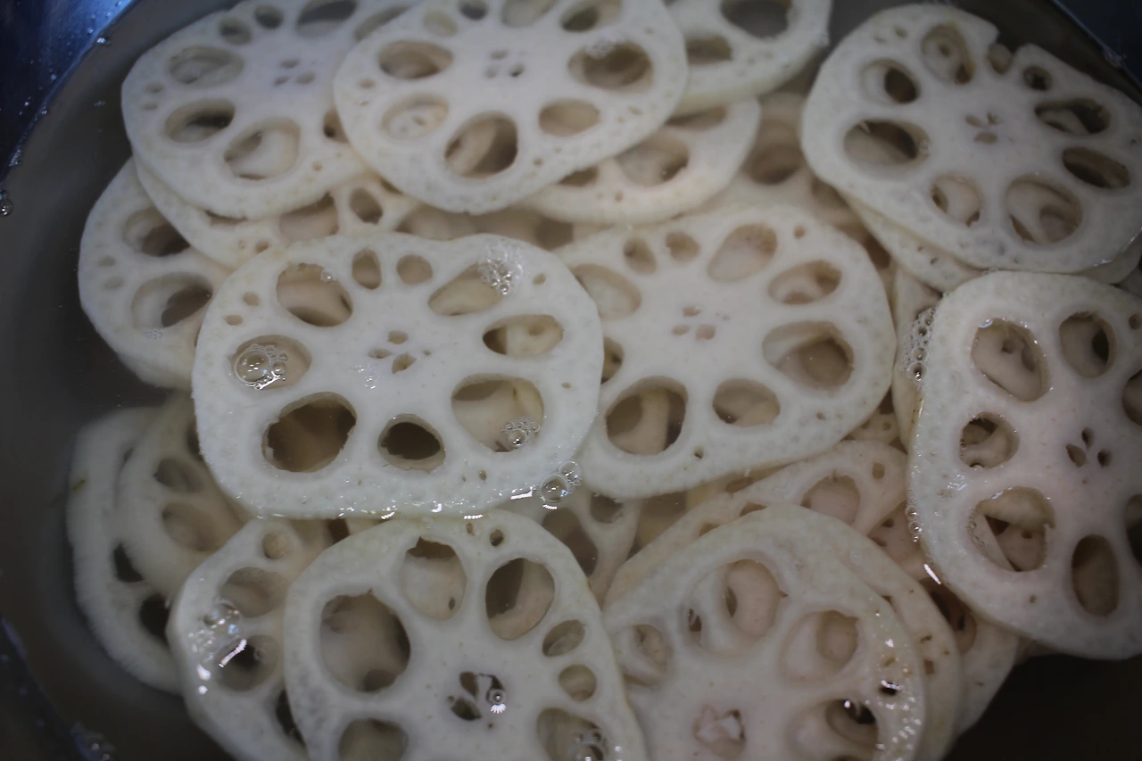 * 주 재료: 연근 1개 (200g), 식초 1T + 물 (연근이 잠길 정도).