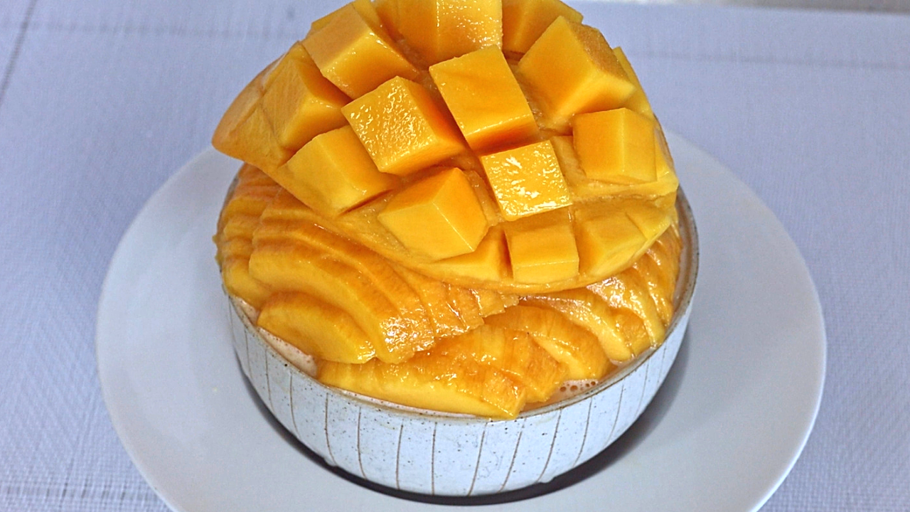 4. 그릇에 망고 아이스크림 - 우유 얼음 - 연유 - 3번 망고 - 우유 얼음 - 2번 망고 순으로 올려 먹는다