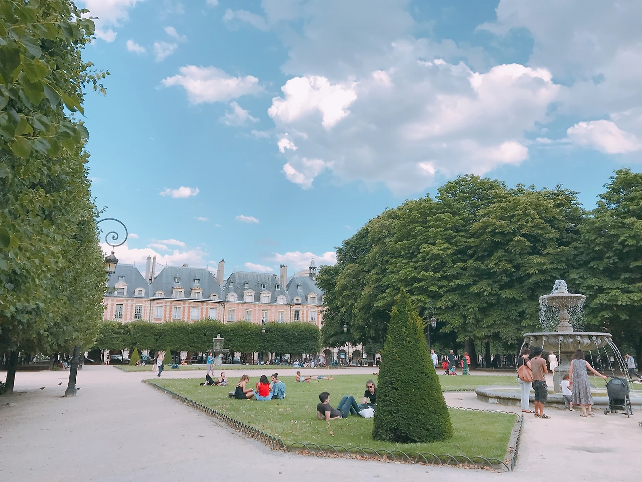 식당에서 나와 좀 더 마레 중심가 쪽으로 걷다 보니 보쥬광장이 나타난다. 다른 공원들에 비해 작고 아담하다. 동네 공원 같은 느낌. 친구들끼리, 혹은 가족끼리 앉거나 누워서 시간을 보내고 있다. 풀밭 위에서 편안하게 늘어져 있는 그들이 부러웠지만 스커트를 입고 나오기도 했고, 돗자리가 없어 앉지는 못했다. 공원 한 바퀴를 돌며 둘러보다가 결국 광장 한 끝에 위치한 카페에 자리를 잡았다.