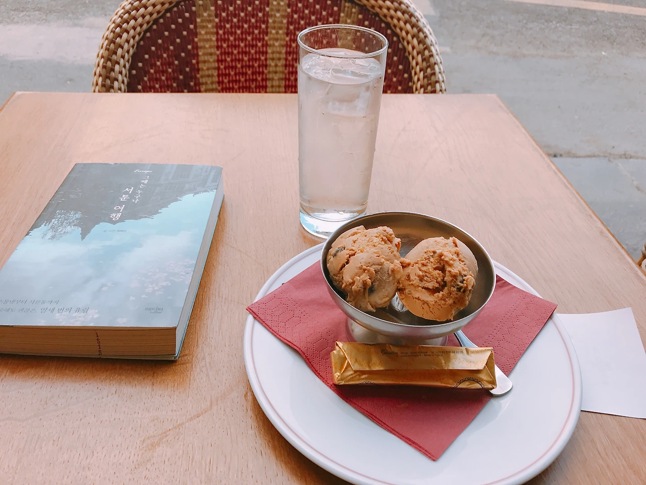 'Ma Bourgogne'는 꽤 오랜 시간 이 자리에 있었던 카페테리아인 듯 외관에서부터 옛 정취가 물씬 풍겨 나왔다. 서버도 나이가 지긋하신 무슈로 유니폼도 굉장히 포멀 했다. 메뉴판의 젤라또가 눈에 띈다. 그래, 과음한 다음날은 무조건 아이스크림이지. 쌀국수, 햄버거, 아이스크림, 해장 3종 세트로 오늘을 마무리해 보자. 아이스크림에 초콜릿까지 덤으로 내준다. 득템. 알코올로 머릿속이 꽉 차서인지 불쑥불쑥 떠올라 마음을 어지럽히던 생각들이 들지는 않았다. 먹고, 걷고, 멍 때리고, 읽었던 시간. 파리 여행 7일 차는 이렇게 저물어갔다.