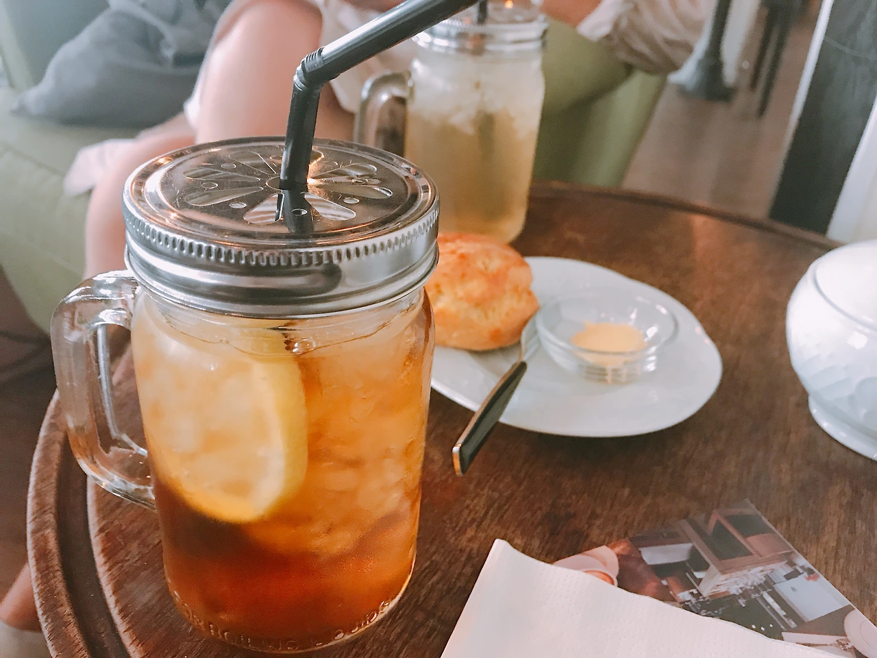 어중간한 시간이어서인지 내부엔 손님의 거의 없었다. 우리가 거의 전세 낸 듯한. 이런 거 무척 좋아한다. 사진도 마음대로 찍을 수 있다는 장점도 있고. 오랜 시간 땡볕에 걸어서인지 덥고 목마르다. 어서 마실 것부터 시키자. 주문한 아이스티와 스콘이 나왔다. 마음에 쏙 드는 큼지막한 저그에 담긴 음료와 넉넉한 얼음조각들. 이곳을 선택한 나 자신을 칭찬해.