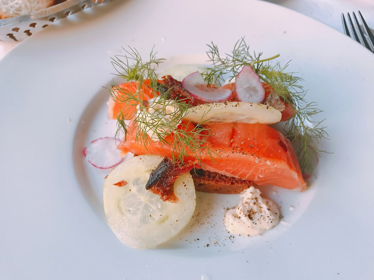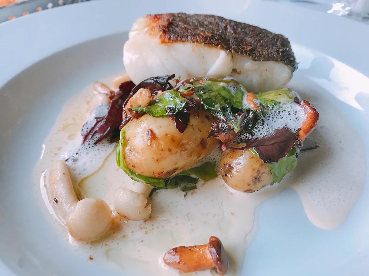 앙트레로는 연어와 horseradish 크림, 플라는 팬 프라이 된 대구와 버섯 요리를 선택하고 화이트 와인 한 잔을 곁들였다. 이런 음식에 와인이 빠질 순 없다. 원래 육지 고기를 집중적으로 파는 스타일인데 이날은 웬일인지 모두 바다로 택했다. 날씨가 더워서 가벼운 음식을 받아들이기로 했나 보다.