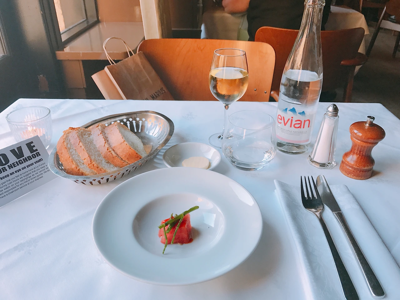 식사는 앙트레와 플라, 플라과 디저트의 2코스, 혹은 앙트레, 플라, 디저트 3코스 이렇게 선택할 수 있다. 내 선택은 앙트레와 플라. 메뉴를 주문하면 아뮤즈 부쉬와 식전 빵, 그리고 버터를 먼저 내어 온다.