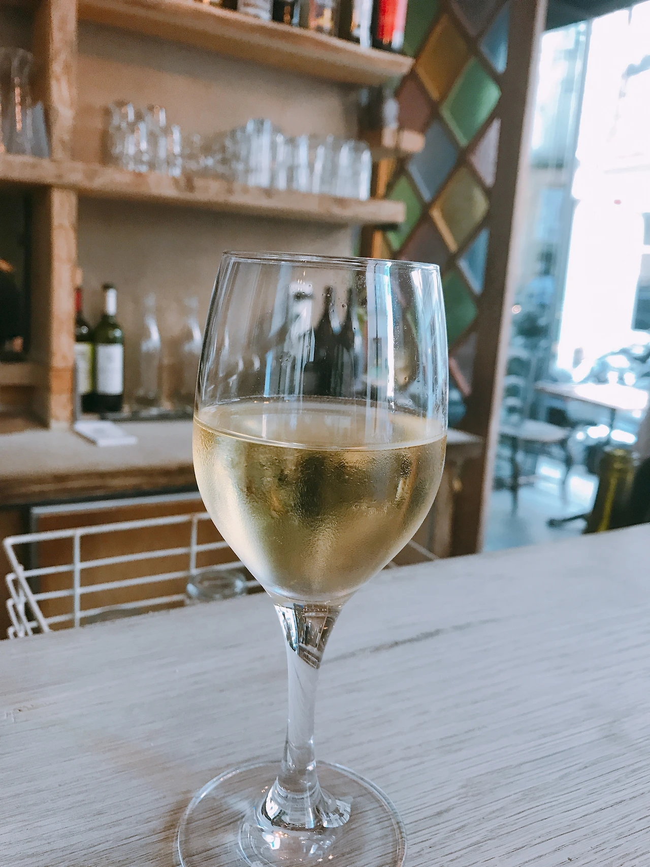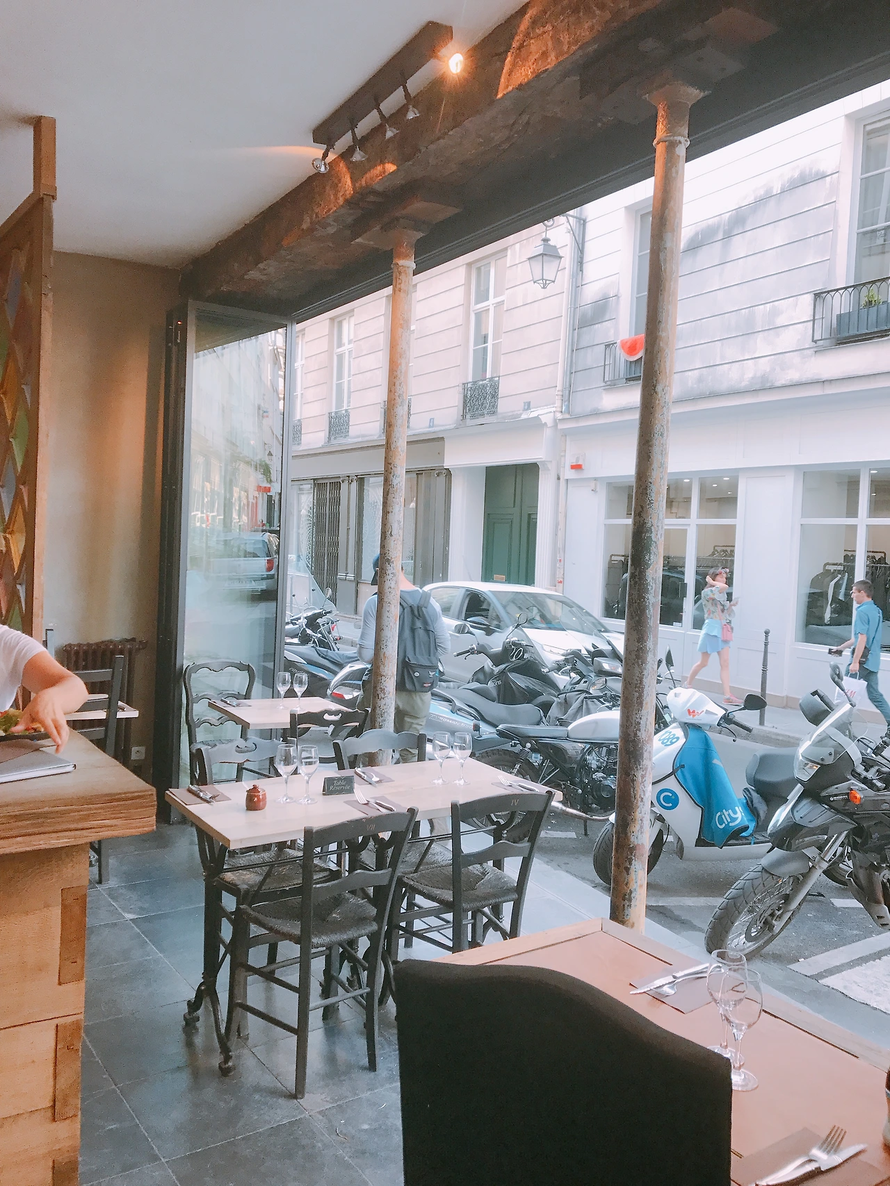 이렇게 고마울 데가. 아마도 매니저가 나의 눈동자에서 실망과 안타까움을 읽었던 게 아닐까. 냉큼 자리에 앉아 화이트 와인 한 잔을 주문한다. 금세 따라주고 매니저는 자기 볼 일을 보러 갔다. 넋 놓고 앉아 시원한 와인을 홀짝이며 창 밖을 구경한다. 마레의 중심가 쪽이 아니어서 조용하고, 오후에서 저녁으로 이어지는 애매한 시간이어서인지 오가는 사람도 적다. 참 멍 때리기 좋은 곳이네.