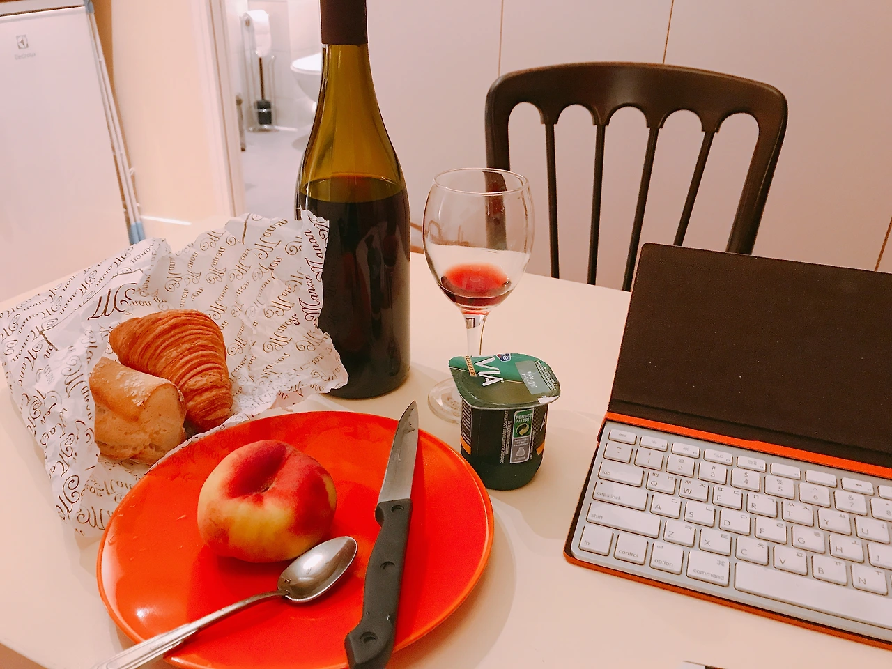 동네 한 바퀴 돌고 오는 길에 파리지앵들로 붐비는 블랑제리에서 크로와상과 바게트를 사고 근처 유기농 마트에서 요거트와 납작 복숭아를 담았다. 사진에 보이는 와인은 Remi가 웰콤 기프트로 선물한 와인. 무슨 와인이었는지 이름은 잘 모르겠지만 붉은 베리향이 올라오는 가벼운 아이였던 걸로 기억한다.
