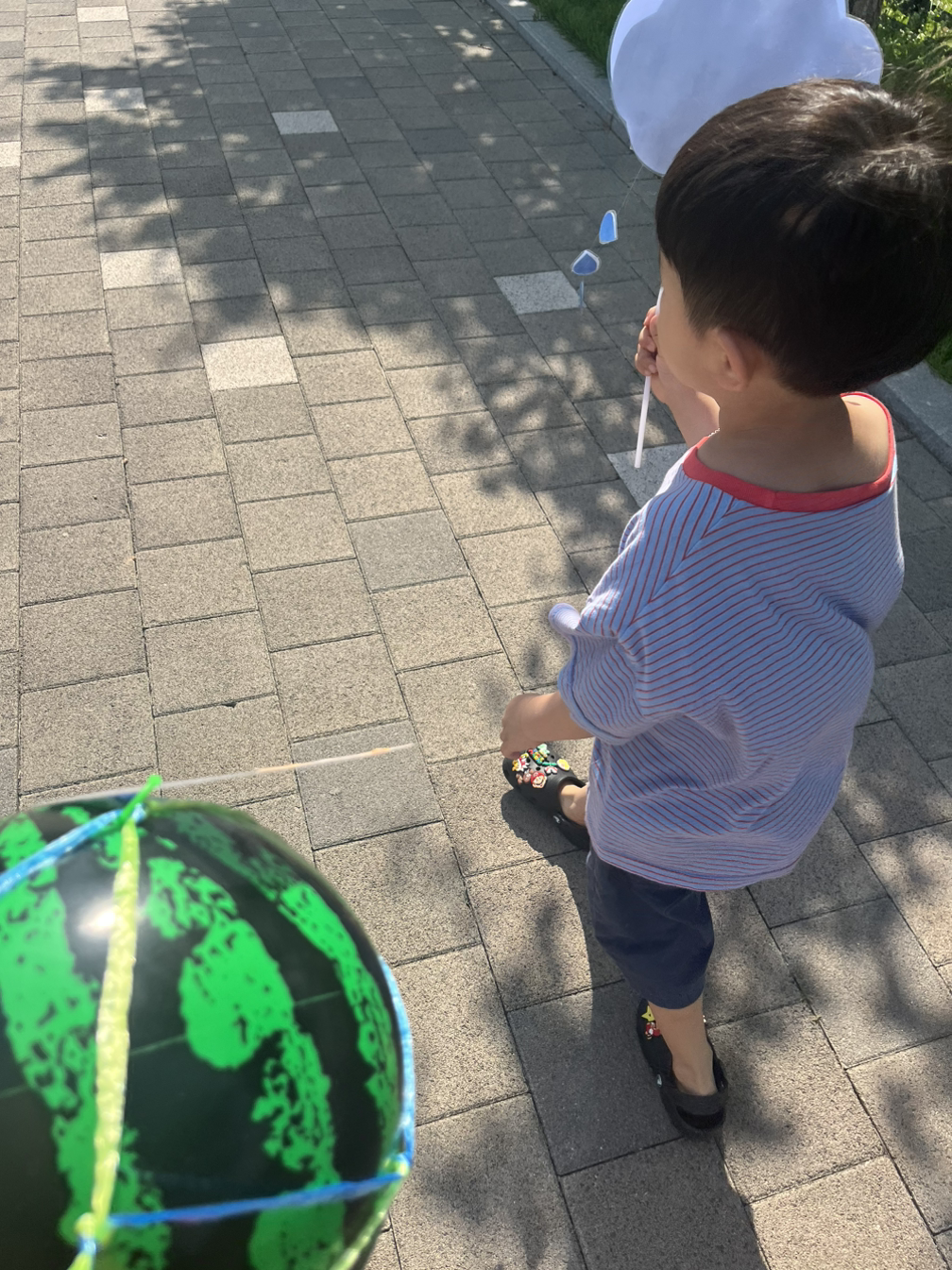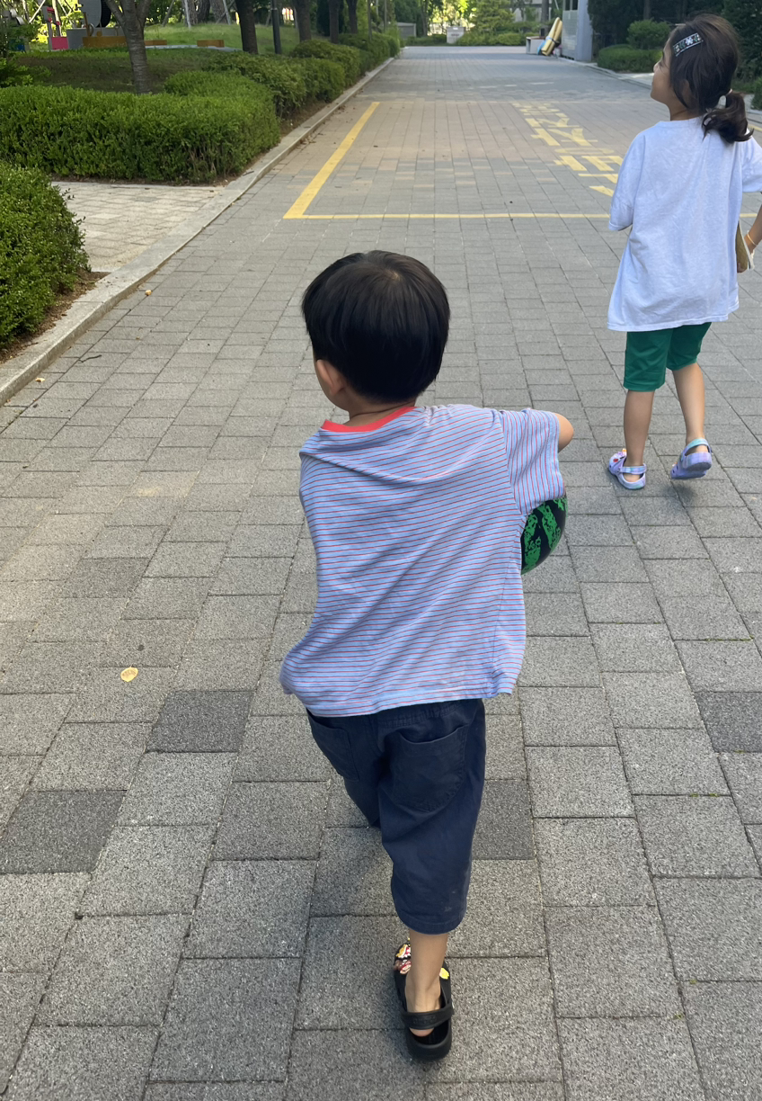 둘을 피아노학원에 바로 데려다주고 혼자 걸어와야 했는데, 나는 가짜수박을 수박줄에 끼우고 비가 내리는 구름 부채를 들고 씩씩하게 걸어왔다.