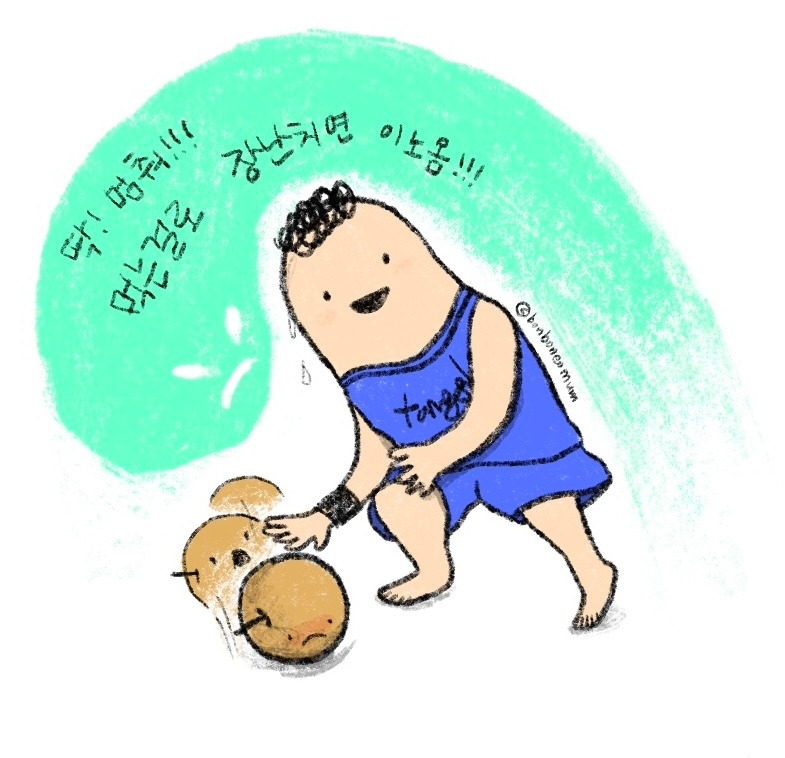 후다닥 말려보았지만 이미 개구쟁이 얼굴로 매트바닥에 배를 튀기고 있던 터라, 한발 늦어버렸다.