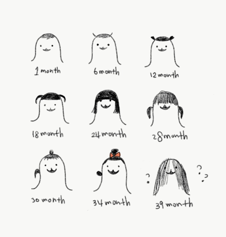 요즘의 봉봉은 앞머리를 기르게 되면서 시작된 동글동글 달팽이머리를 하고다닌다. 달팽이머리는 봉봉이가 지은 그 머리모양의 이름인데, 사실 어멈과 욥이 볼때는 그머리는 상투머리에 가깝다.