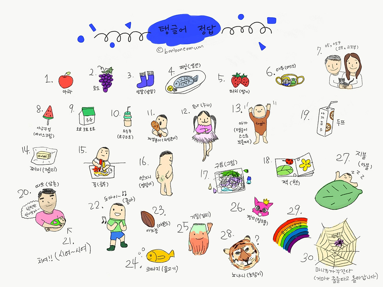27.지불(이불) 28.뇨냐니(호랑이) 29.무지째깔(무지개색깔)