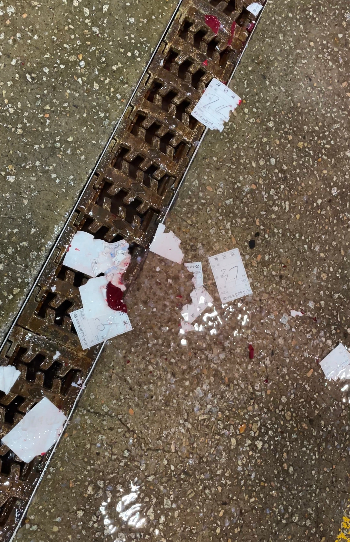 ‘활어’ 경매가 끝나갈 무렵, 찢긴 계근표 조각들이 핏덩이들과 함께 배수 구멍에 걸렸다.