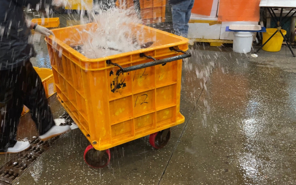“물 튀어요.” 직원이 말했다. 커다란 노란 수레에 있던 물살이들은 온몸을 움직였고, 물이 사방으로 튀었다.